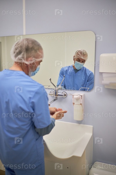 Мужчина среднего возраста моет руки перед операцией в операционной