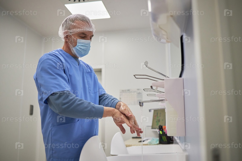 Мужчина-хирург среднего возраста чистит руки перед медицинской процедурой