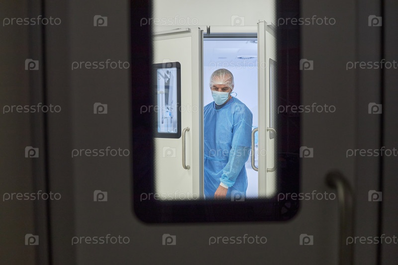 Мужчина среднего возраста, носящий хирургический халат, входит в операционную