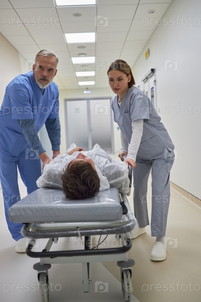 Пожилой мужчина и молодая взрослая женщина перевозят пациента в больницу