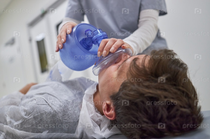 Человек, получающий кислородную поддержку во время экстренной медицинской помощи