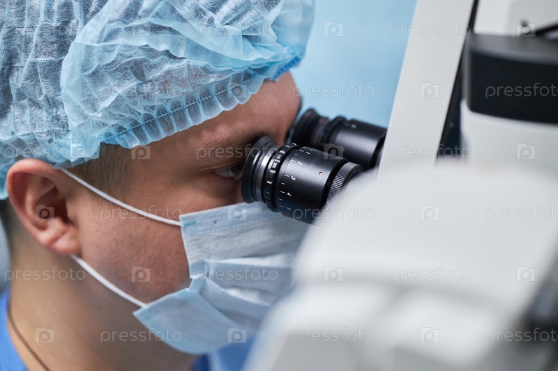 Хирург, осматривающий пациента с помощью хирургического микроскопа мужского пола