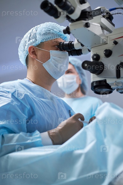 Хирург Операционный микроскоп во время хирургической процедуры Мужчина