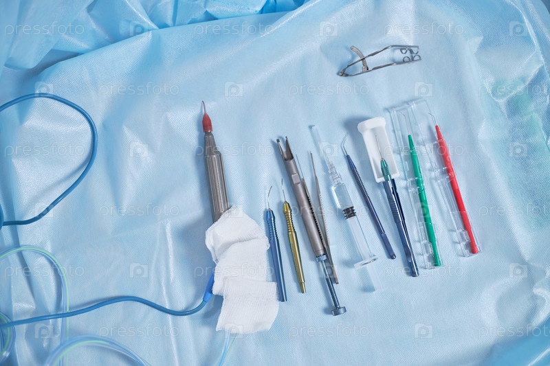 Хирургические инструменты расположены на стерильном столе в условиях операционной