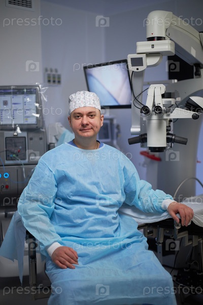 Портрет мужского хирурга среднего возраста, сидящего рядом с хирургическим оборудованием