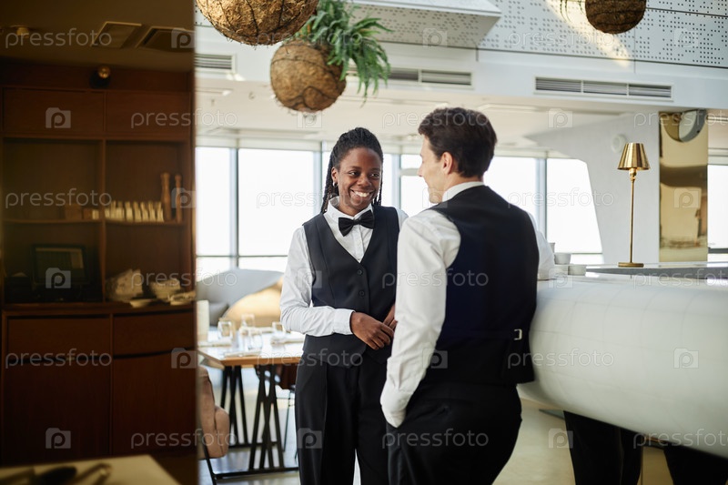 Молодой взрослый мужчина и чернокожая женщина Рабочие ресторана разговаривают в помещении