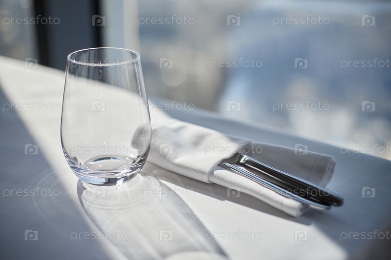 Пустой ресторанный стол с стеклянными и серебряными принадлежностями под окном