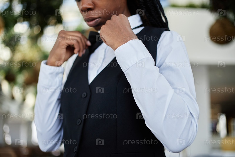 Молодая взрослая чернокожая женщина корректирует галстук во время подготовки к работе в ресторане