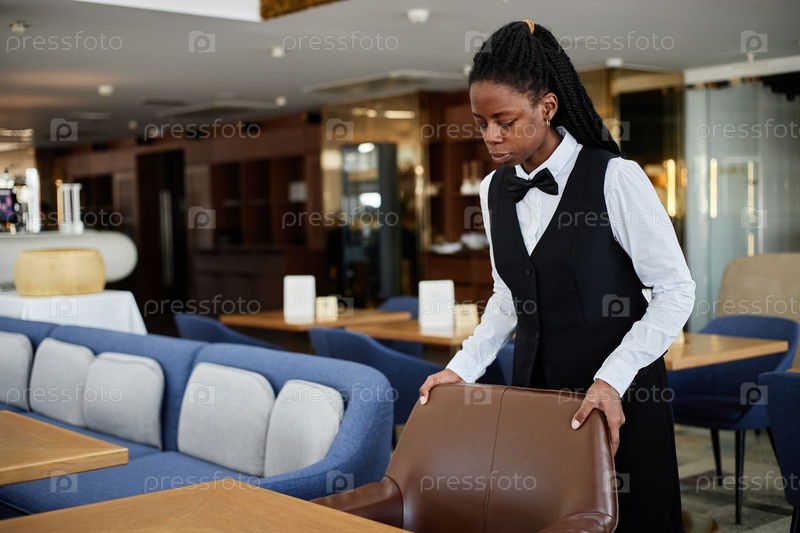 Молодая взрослая чернокожая женщина Работница ресторана устраивает стул во время рабочей смены