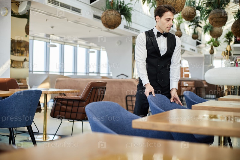 Молодой взрослый мужчина устраивает стулья, работая в интерьере ресторана