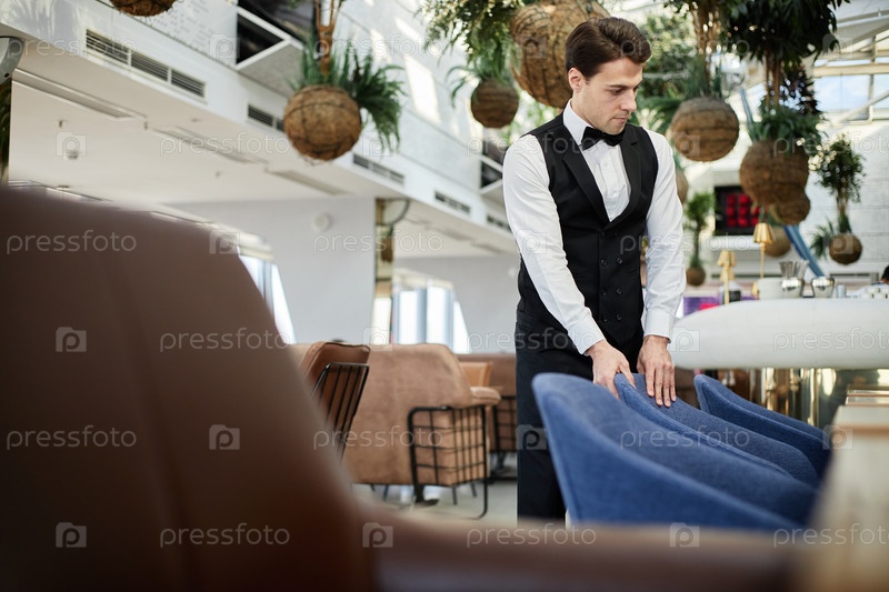 Молодой взрослый мужчина устраивает стулья, работая в современном ресторане