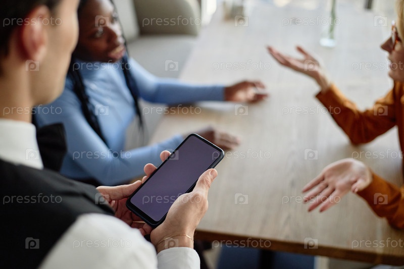 Молодой человек использует смартфон, разговаривая с различными клиентами