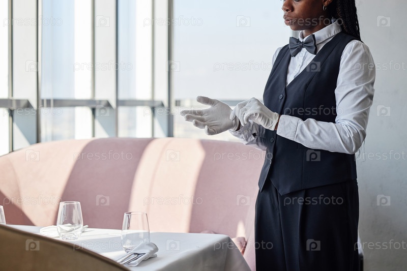 Молодая взрослая чернокожая женщина-ресторанный работник надевает перчатки перед подачей