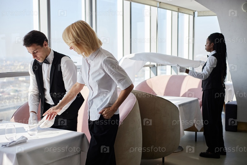 Мультиэтнические молодые взрослые работники ресторанов, готовящие столы перед обслуживанием