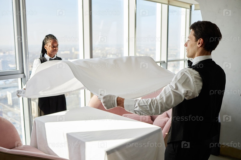 Молодой человек и молодая чернокожая женщина готовят стол в ресторане