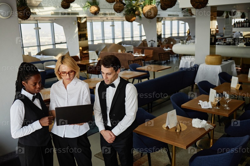 Женщина и молодые коллеги по работе обсуждают задачи ресторана