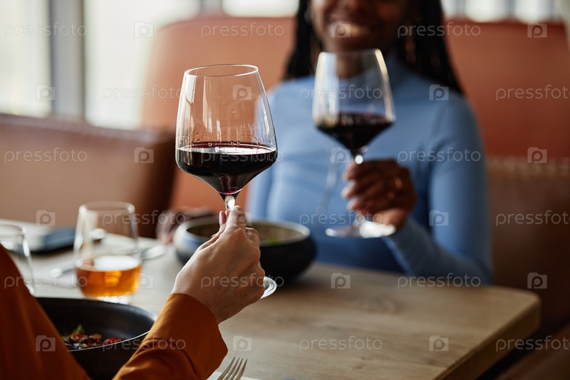 Молодые взрослые женщины тостируют бокалы с вином во время обеда в ресторане