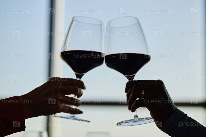 Друзья тостируют бокалы с вином в ресторане руками