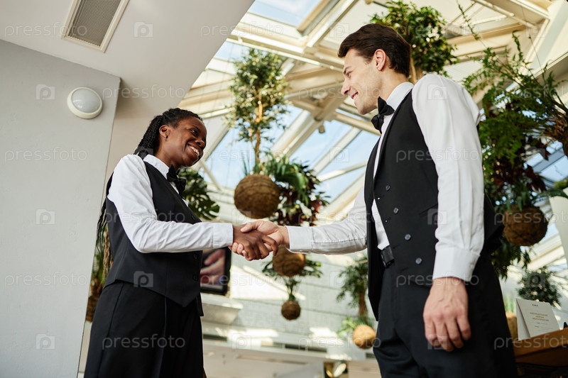 Молодая взрослая чернокожая женщина и мужчина пожали друг другу руки в ресторане