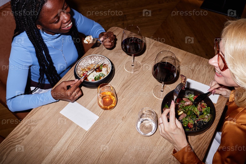 Молодая взрослая чернокожая женщина и женщина среднего возраста наслаждаются едой в ресторане