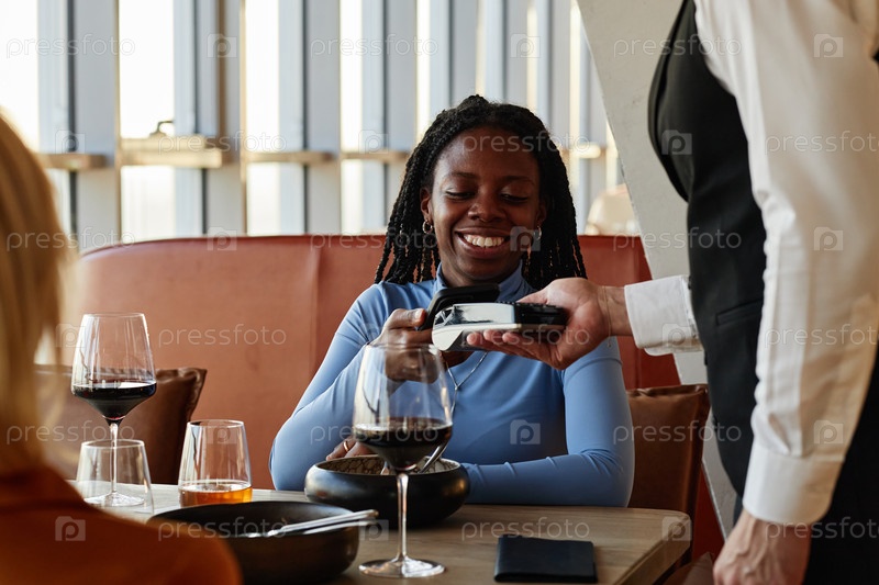 Молодая взрослая чернокожая женщина платит счет ресторана с помощью карточного читателя, улыбаясь