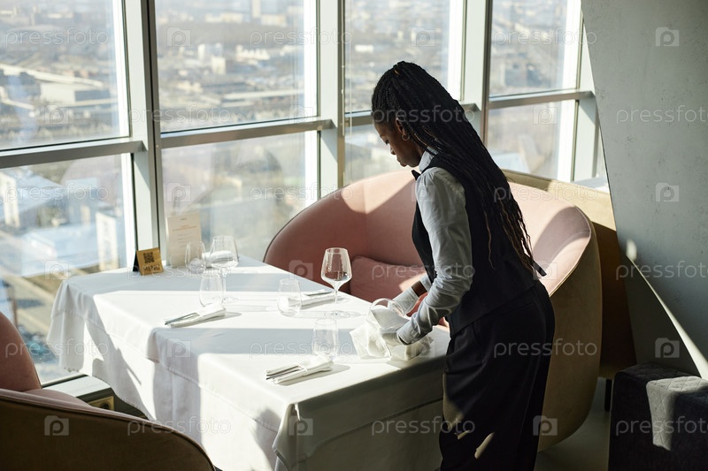 Молодая взрослая чернокожая женщина полирует винное стекло, работая в ресторане