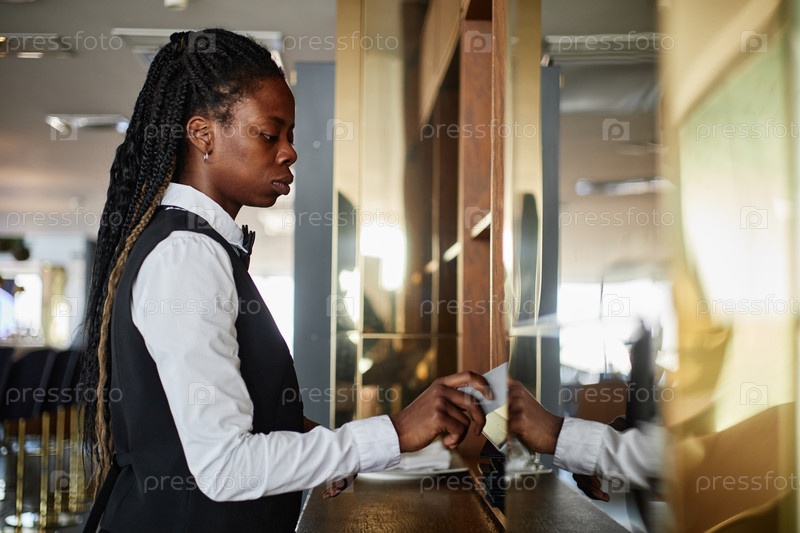 Молодая женщина-работница ресторана, обрабатывающая платежи за стойкой