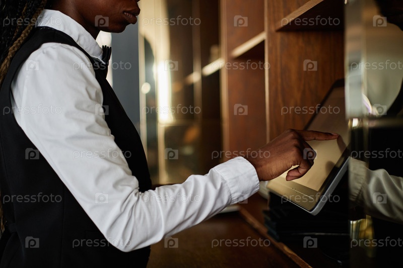 Молодая взрослая чернокожая женщина с помощью сенсорного экрана регистрирует работу в ресторане