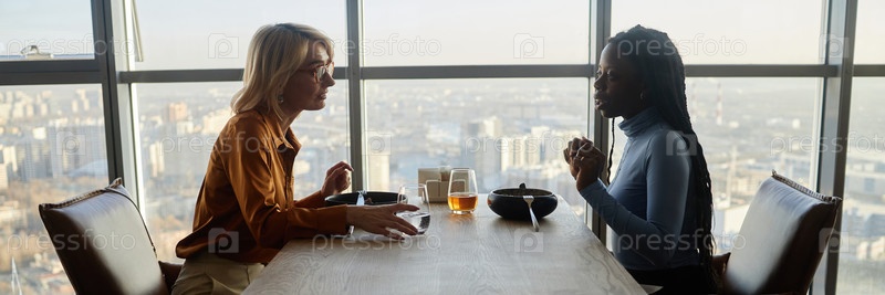 Взрослая женщина и чёрная женщина разговаривают во время обеда в ресторане