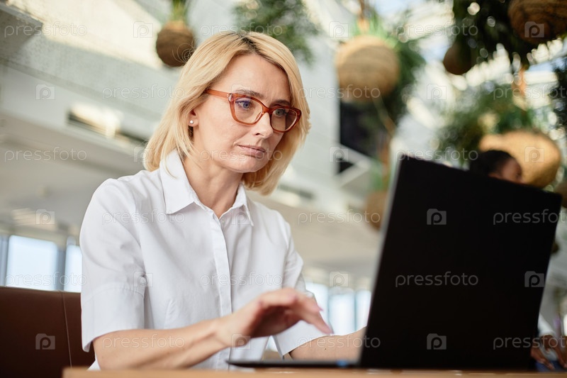 Женщина средних лет, работающая на ноутбуке в ресторане