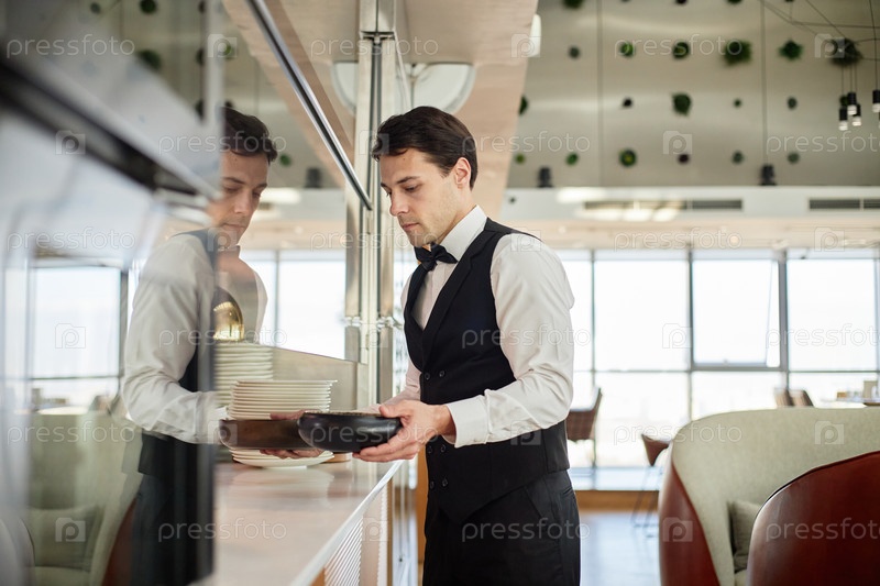 Молодой взрослый мужчина Работник ресторана готовит посуду в столовой