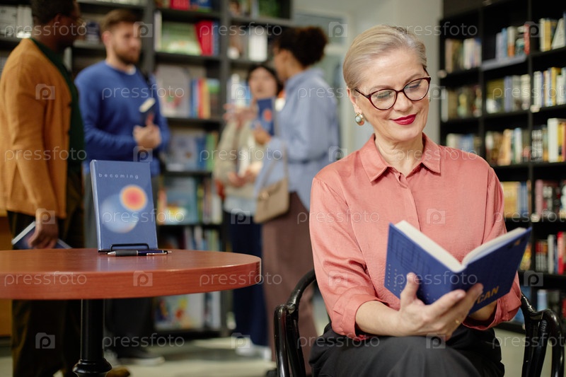 Старшая женщина читает книгу в библиотеке