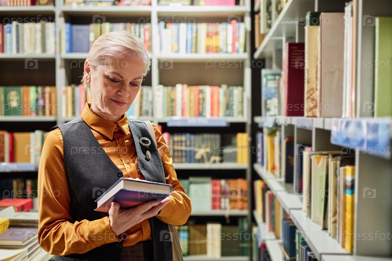 Старшая женщина улыбается, читая книгу в коридоре библиотеки