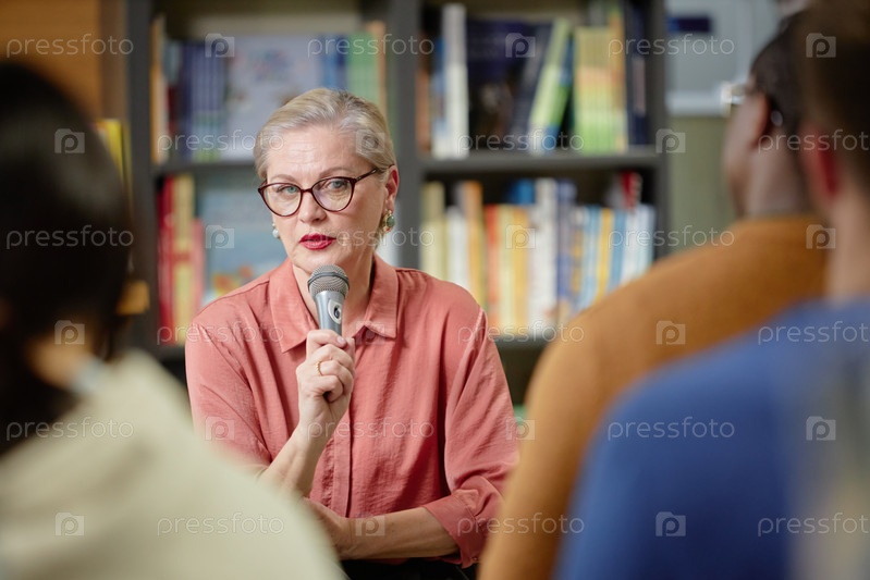 Женщина среднего возраста, говорящая в микрофон во время групповой дискуссии
