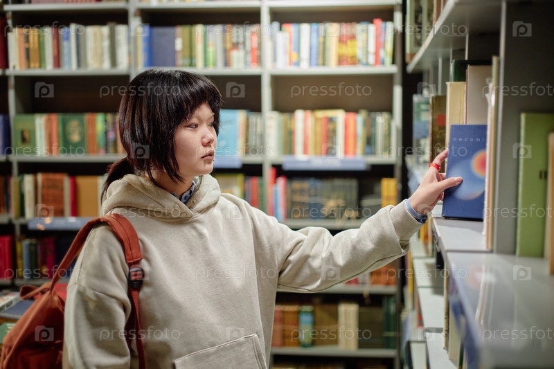 Молодая взрослая азиатская женщина выбирает книгу на полке библиотеки во время учебы