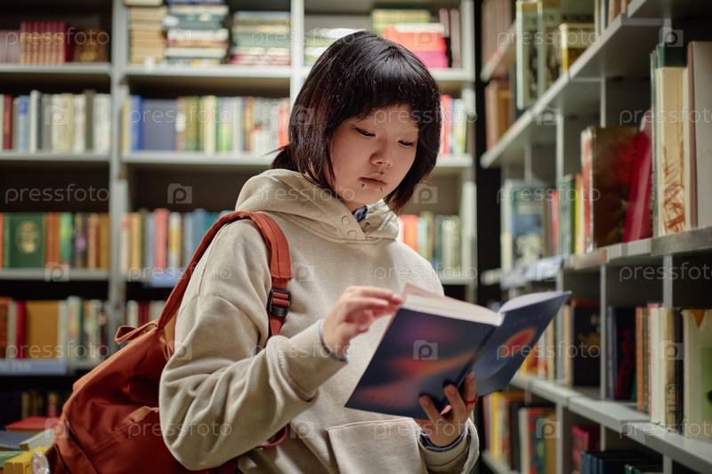 Азиатская девочка-подросток читает книгу, стоя между книжными полками в библиотеке