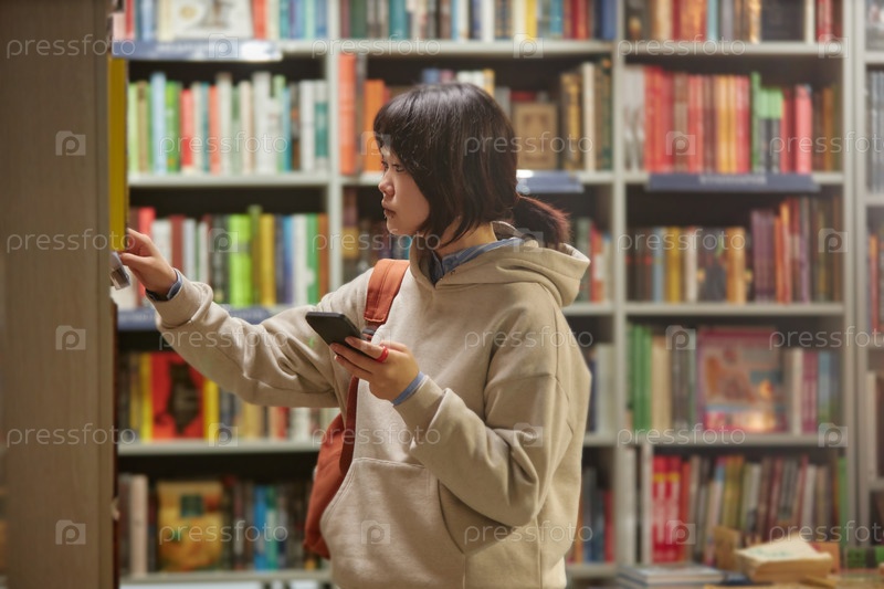 Молодая азиатская женщина просматривает книжные полки, держа смартфон в книжном магазине