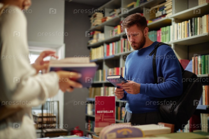 Молодой взрослый мужчина просматривает книги в книжном магазине, стоя внутри