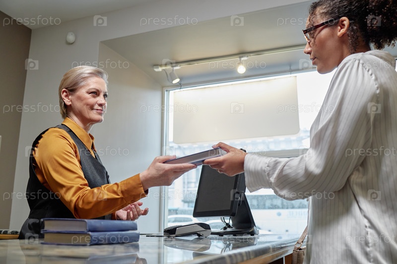 Женщина среднего возраста вручает книгу молодому взрослому черному женщине в помещении