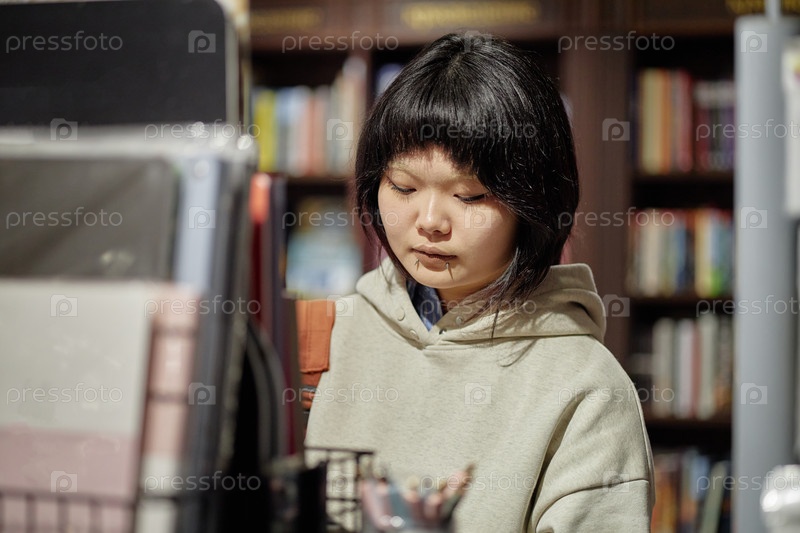 Молодая азиатская женщина просматривает книжные полки в книжном магазине с продуманным выражением