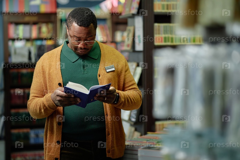 Чернокожий мужчина среднего возраста читает книгу, стоящая в книжном магазине