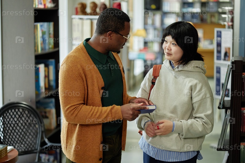 Молодой взрослый чернокожий мужчина объясняет книгу молодой взрослой азиатской женщине в библиотеке