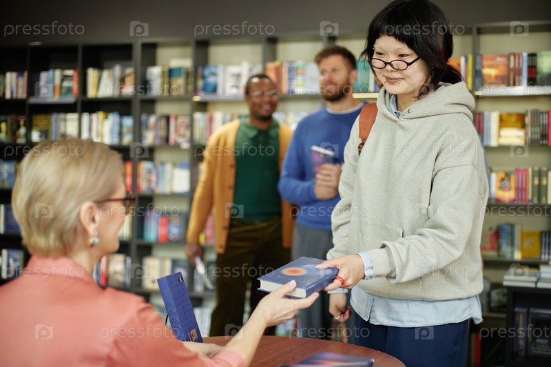 Молодая азиатская женщина получает книгу с автографом от женщины-автора