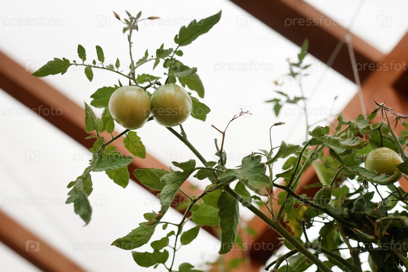 Зеленые помидоры, растущие на виноградной лозе в деревенском саду под деревянной решеткой
