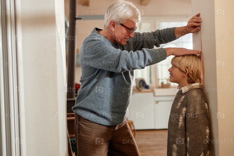 Мужчина измеряет рост внука в сельской семье