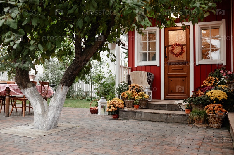 Вход в очаровательный деревенский дом, окруженный осенними цветами и зеленью