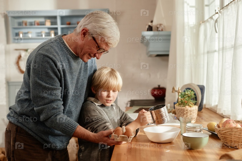 Старший мужчина помогает младшему внуку печь вместе на деревенской кухне