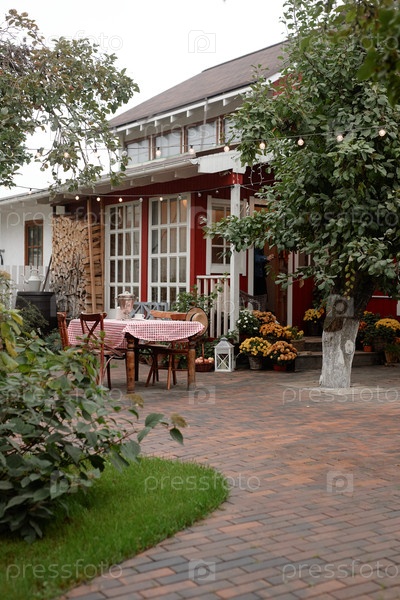 Стоящий во дворе деревенского дома стол с деревьями и цветами