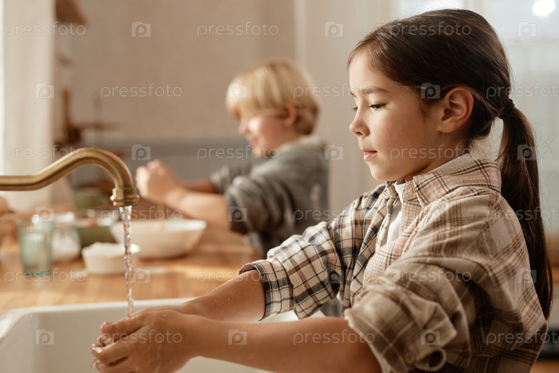 Девочка и мальчик мыют руки вместе на кухне