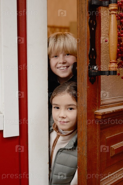 Мальчик и девочка улыбаются, стоя на пороге деревенского дома